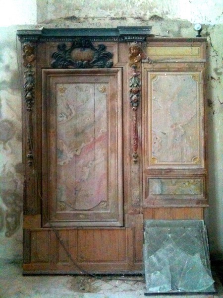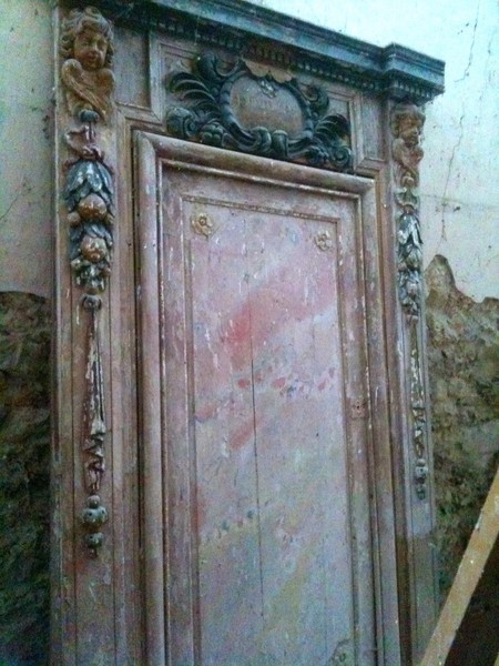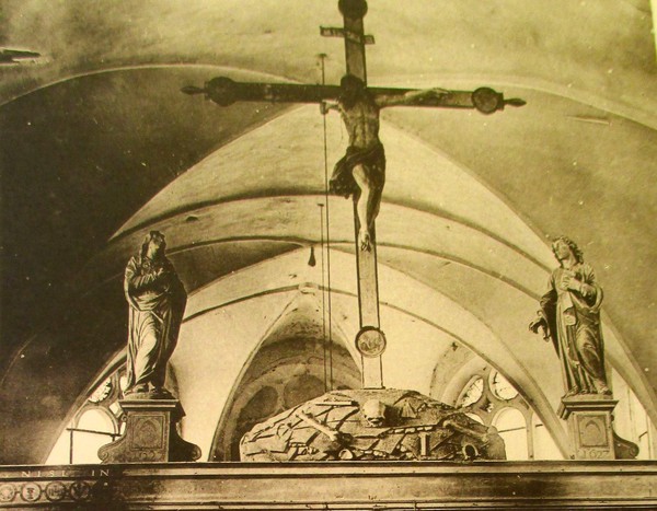 On remarque que l’autel est entouré de panneaux peints (voir photos actuelles n°4-5 et 6) et ferme ainsi l’accès au fond du chœur. Le Christ a déjà un bras en moins. Le sol est déjà en assez mauvais état…