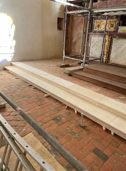Nouveau chantier 14 mars 2023 Un nouveau chantier a été engagé dans l’église : la création de marches pour accéder au maître autel. Ce chantier est entièrement financé par l’Association. Chantier Marches Photos