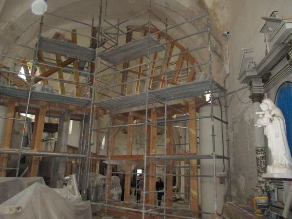 Sur le chantier (janvier 2015) 10 janvier 2015 Avancement des travaux. Voici ce que l’AAEV finance à 60% ! : Étaiement de la voûte centrale, ce qui va permettre de refaire les deux piliers actuellement en béton pour soutenir la poutre de gloire. Photos Chantier