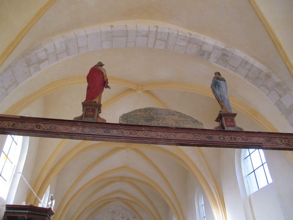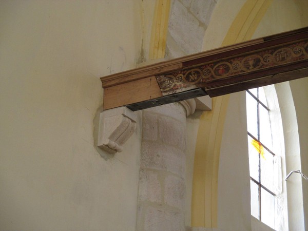 - Poutre de gloire réinstallée avec des corbeaux en pierre taillée et restauration des extrémités.