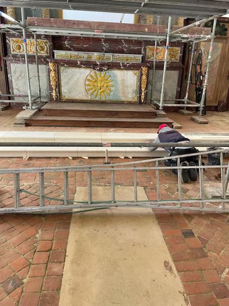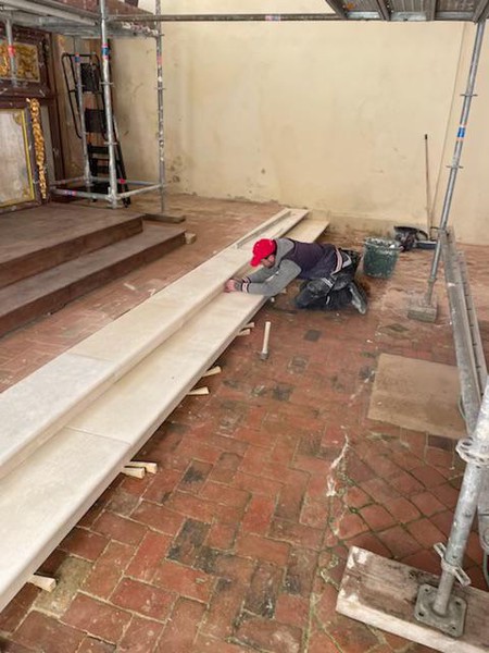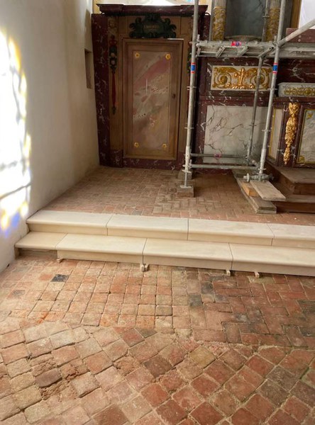 Nouveau chantier 14 mars 2023 Un nouveau chantier a été engagé dans l’église : la création de marches pour accéder au maître autel. Ce chantier est entièrement financé par l’Association. Chantier Marches Photos